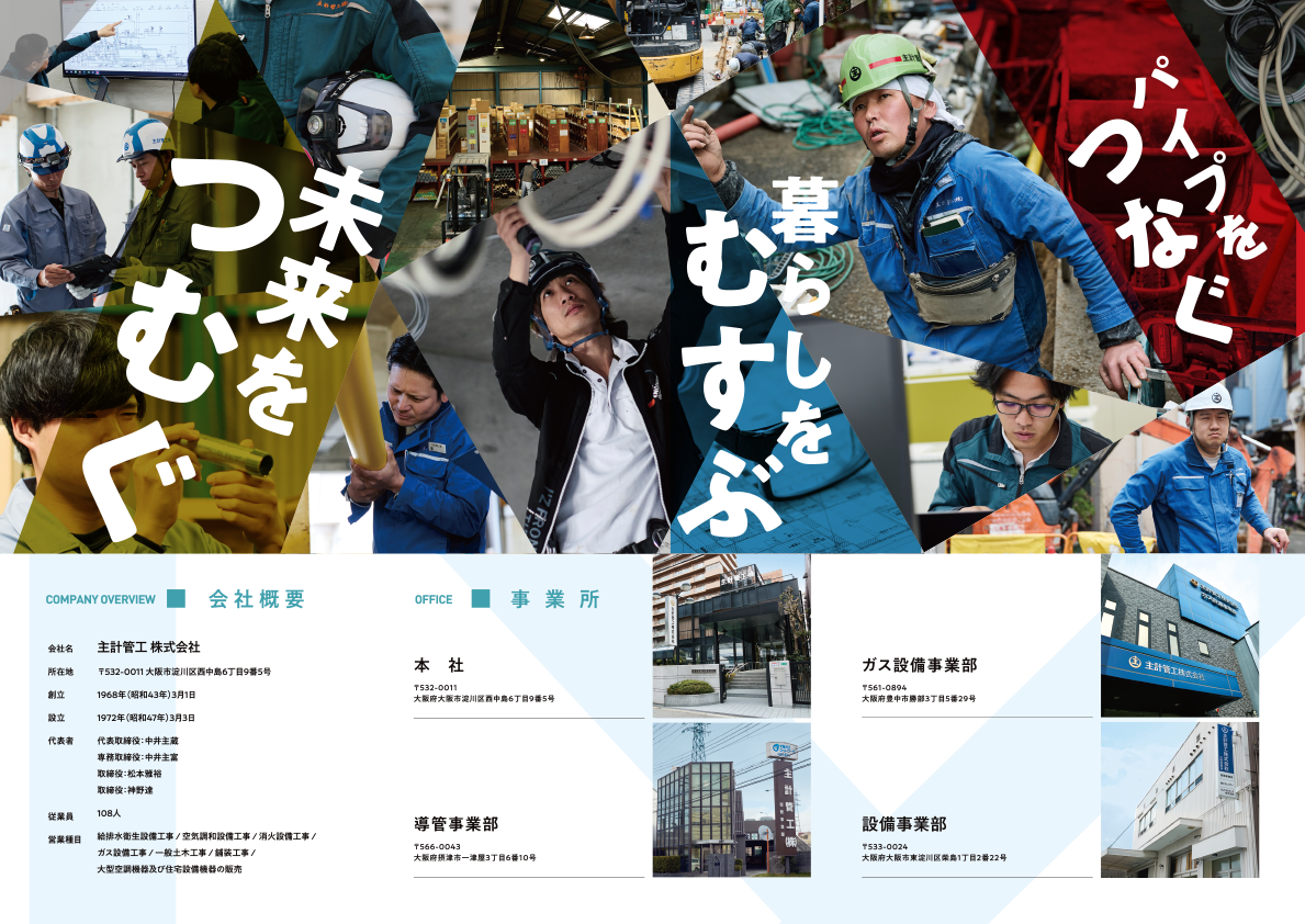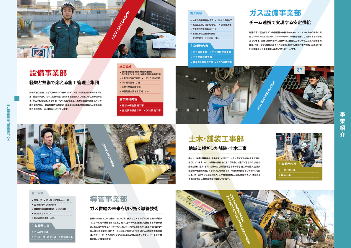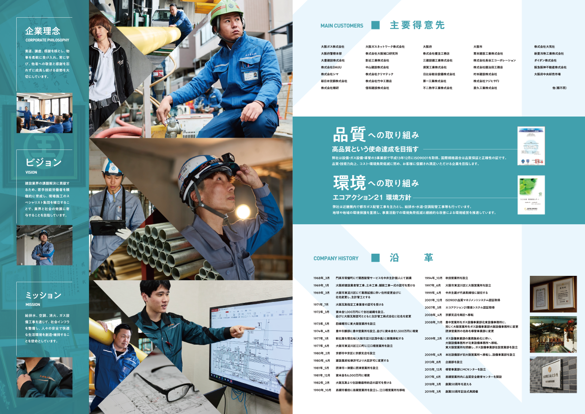 水道管、ガス管といったライフラインを管理・保守する重要な役割を持つ設備工事会社の会社案内書。