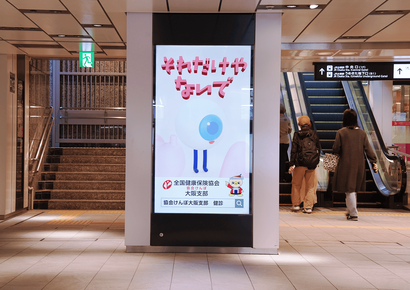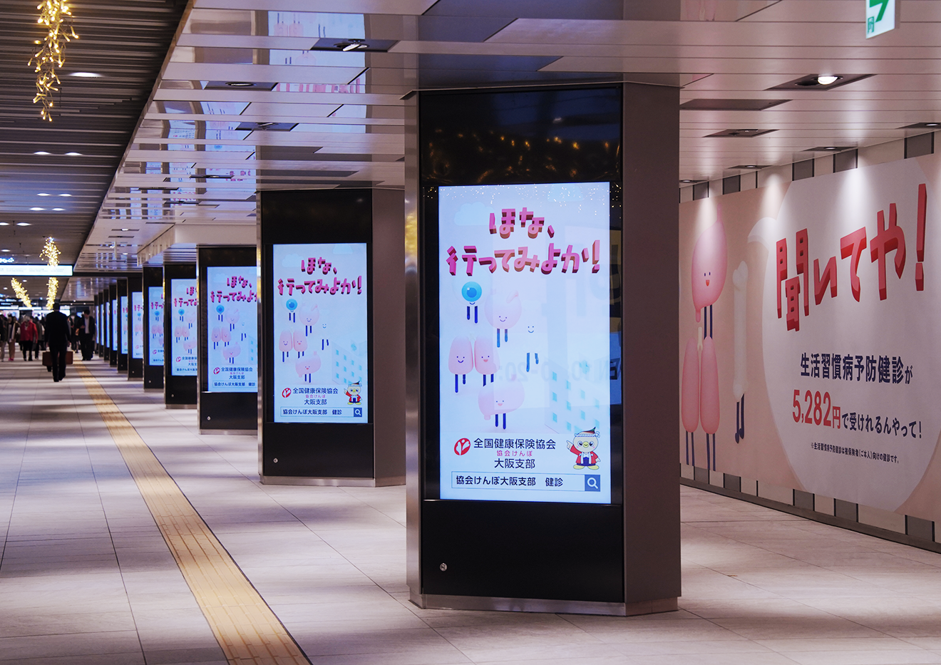 大阪駅前地下道の東西を結ぶ連絡通路に、幅30m・高さ2mの大判ポスターと、47面の連続したデジタルサイネージに動画を掲出。