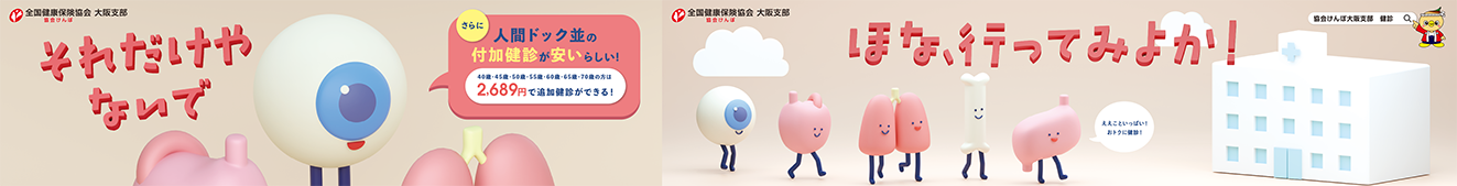 臓器をモチーフとしたクレイ調のキャラクター(3DCG)が、そこを通る人々に健康診断の受診を呼びかけます。