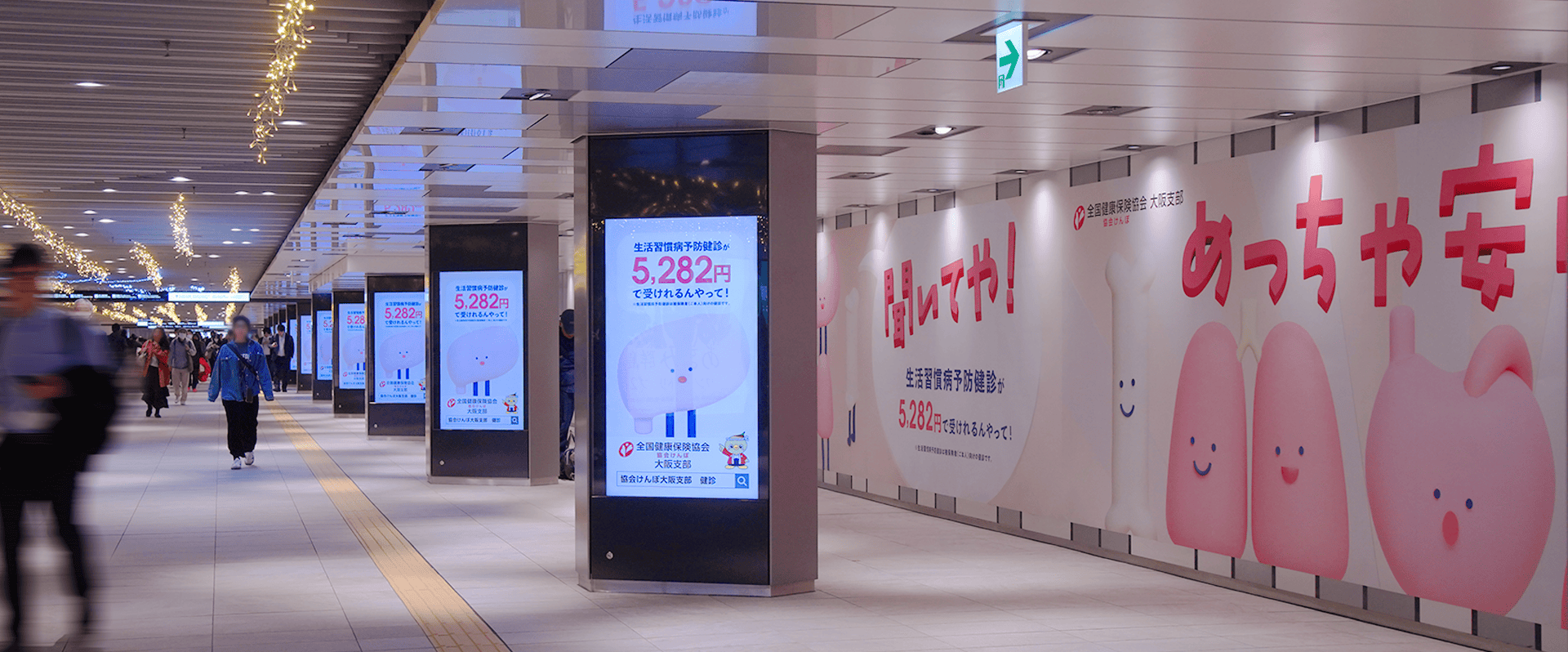 大阪駅前地下道の東西を結ぶ連絡通路に、幅30m・高さ2mの大判ポスターと、47面の連続したデジタルサイネージに動画を掲出。